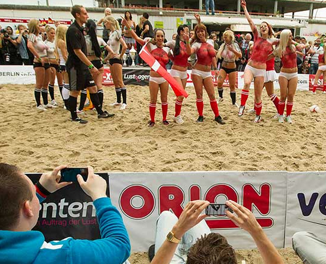 Μια διαφορετική εκδοχή του χθεσινού ματς ανάμεσα στη Γερμανία και τη Δανία παίχτηκε στο Βερολίνο... Όχι από άντρες ποδοσφαιριστές αλλά από γυναίκες που φόρεσαν τα καυτά σορτσάκια τους, και είπαν να παρουσιάσουν μια παρωδία του αγώνα.